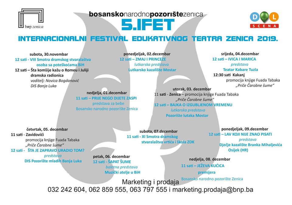 Protekli dani vikenda u zeničkom BNP-u su bili ispunjeni dječijim smijehom, igrom i grajom zahvaljujući zanimljivim i edukativnim programima 5. internacionalnog festivala edukativnog teatra – IFET 2019. U subotu, 30. novembra je ovaj Festival počeo u 12 sati 8. smotrom dramskog stvaralaštva osoba s poteškoćama. Naime, radi se o jedinoj smotri u BiH ovakvog tipa koji osmi put okuplja djecu s poteškoćama u razvoju iz cijele države.