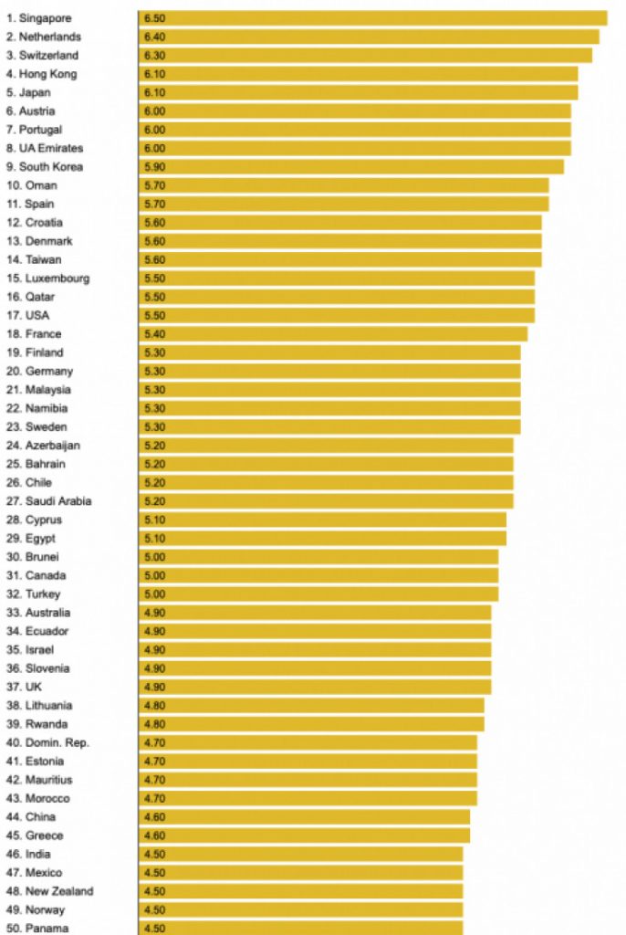 Podaci za ovu kartu dolaze iz Izvještaja o globalnoj konkurentnosti Svjetskog ekonomskog foruma za 2019., u kojem je ocijenjena 141. država, a teme su bile različite.