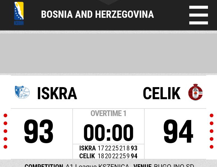U produžetku, koji traje 5.minuta kao i u čitavoj utakmici dosta nervoze, grešaka, a 13 sekundi prije kraja Adi Bambur pogađa za vodstvo Čelika 93:94, domaćini nisu uspjeli da postignu koš za pobjedu tako da je utakmica završena 93:94 u korist OKK Čelik iz Zenice.