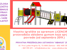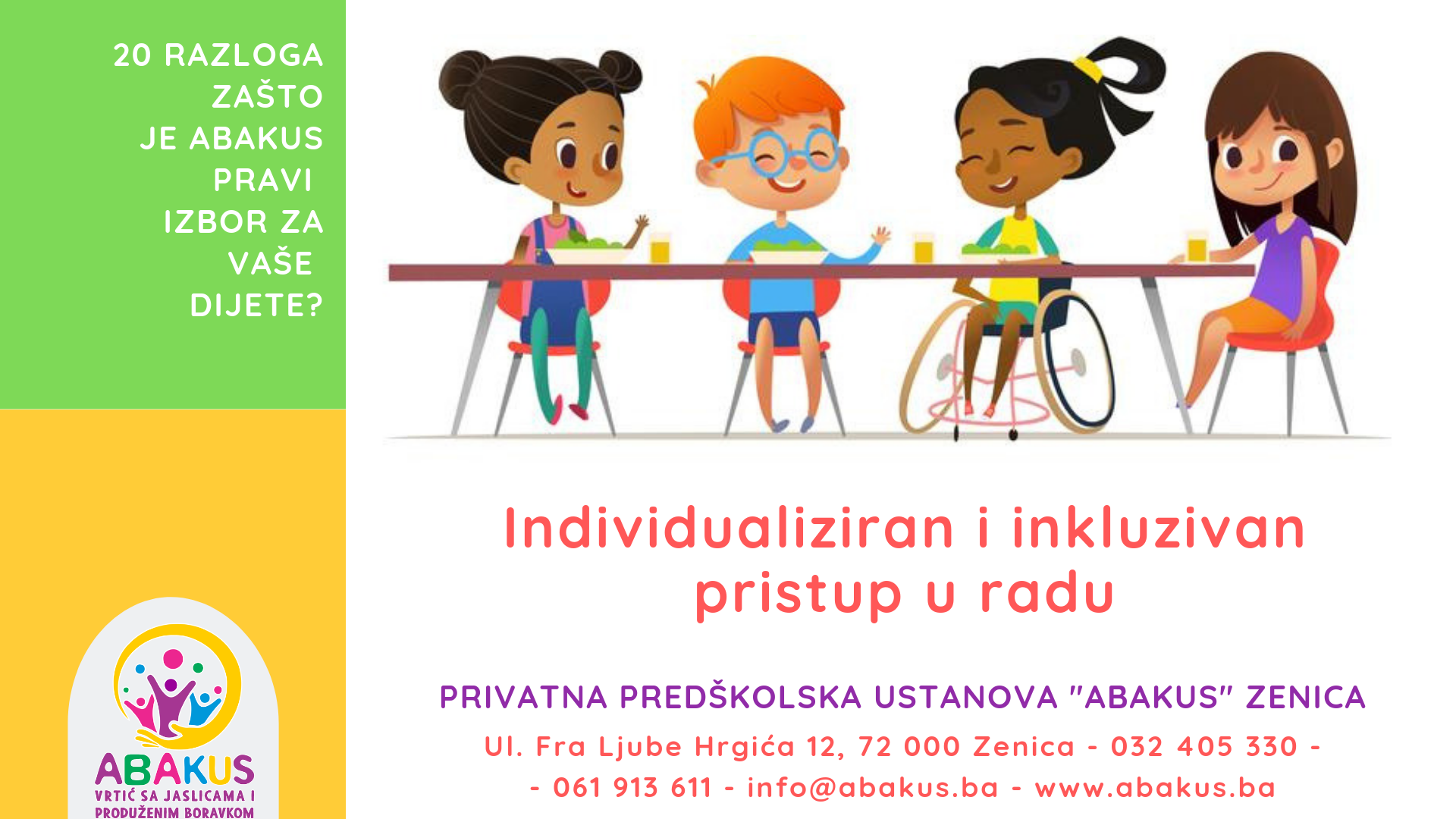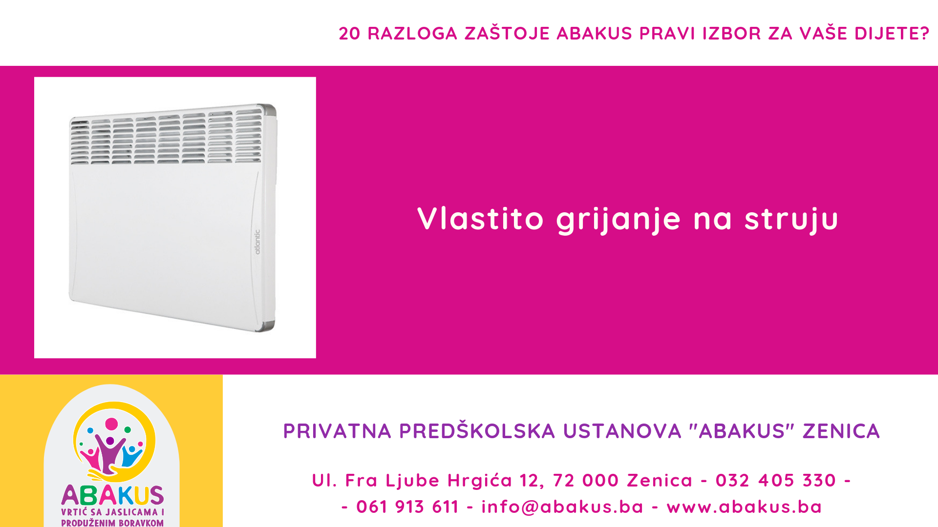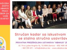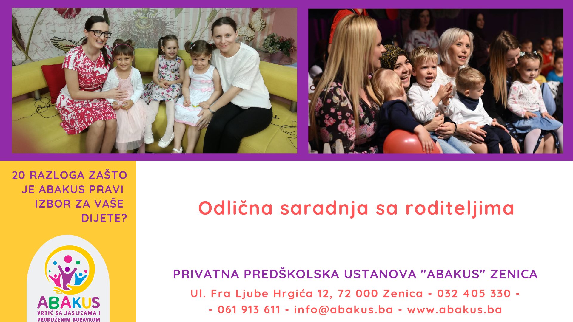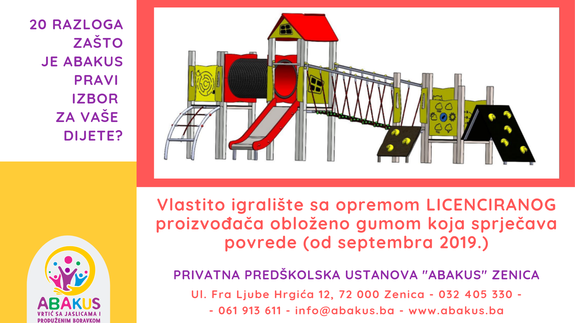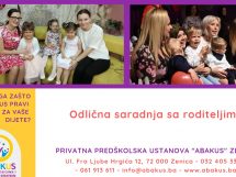 Stručan kadar sa iskustvom, siguran i poticajan prostor, zdrava ishrana, savremene metode u radu, učenje stranih jezika, priredbe, izleti, boravak na otvorenom prostoru, vlastito grijanje na struju, stalni videonadzor, odlična saradnja sa roditeljima, pristupačne cijene, samo su neki od mnogobrojnih razloga zašto već 10 godina roditelji koji biraju najbolje za svoje djete biraju „Abakus“.