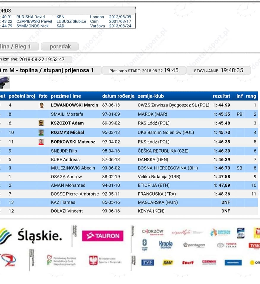 Prvo mjesto zauzeo je Marcin Lewandovski s rezultatom 1:44.99, Abedin je istrčao rekord sezone s rezultatom 1:46.73. Svakako da je ovo sjajan rezultat za našeg takmičara, koji je i na Evropskom prvenstvu trčao veoma dobro, ali je bez ikakve potrebe od strane organizatora diskvalifikovan zbog navodnog guranja, odnosno ometanja protivnika, iako je to daleko od istine.