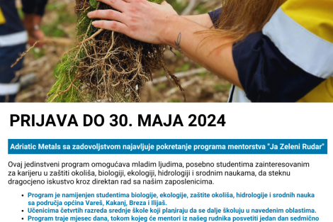 „Pozivamo sve zainteresovane studente i učenike da se jave na ovaj konkurs i pridruže nam se u očuvanju našeg okoliša i izgradnji održive budućnosti kroz program „Ja Zeleni Rudar”. Na kraju programa, učenici koji uspješno završe praksu dobit će Diplomu o završenoj praksi što će biti jedna od važnih referenci za njihov CV. Na ovaj način želimo podijeliti naše znanje i dragocjena iskustva sa studentima i učenicima iz lokalne zajednice, i vjerujemo da će neki od njih sutra biti zaposlenici naše ili neke druge kompanije koja ima najviše standarde zaštite okoliša“, isitiču u kompaniji Adriatic Metals BH d.o.o. .