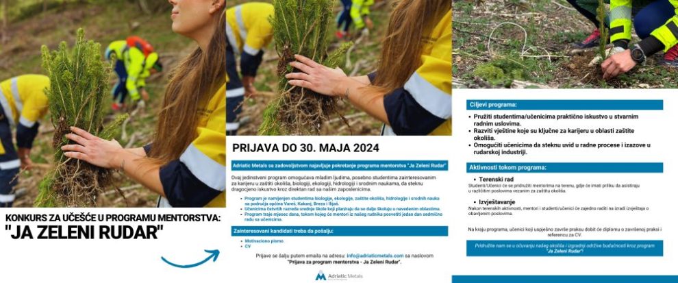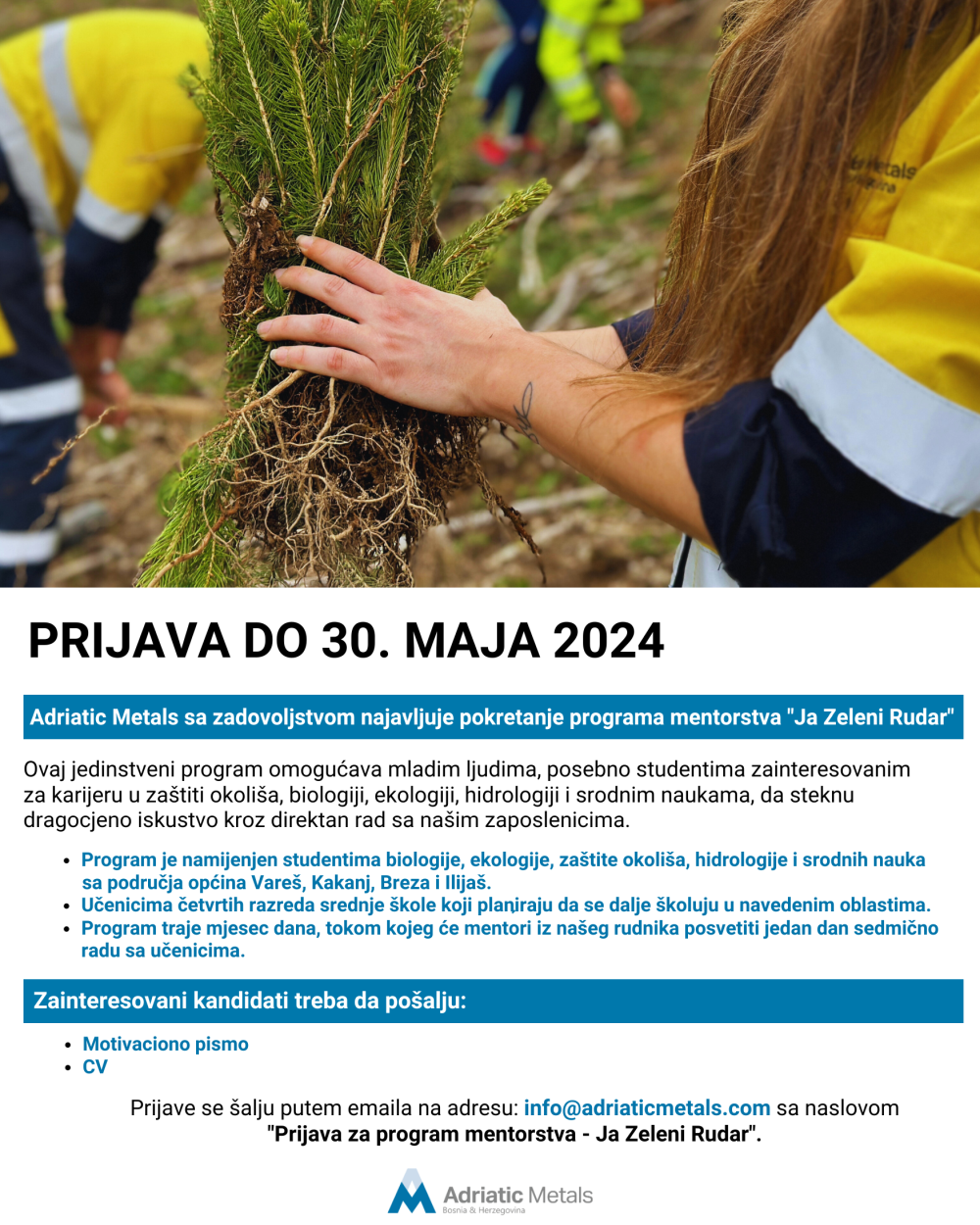 Adriatic Metals  BH d.o.o., lider savremenog i održivog rudarenja u regiji Jugoistočne Evrope, objavio je danas poziv za prijave na Konkurs pod nazivom “Ja Zeleni Rudar”.  Radi se o jedinstvenom programu mentorstva koji omogućava mladim ljudima, posebno studentima i maturantima zainteresovanim za karijeru u oblasti prirodnih nauka, da steknu dragocjeno iskustvo kroz direktan rad zajedno sa zaposlenicima kompanije Adriatic Metals.