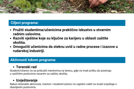 Fokus je na terenskim aktivnostima i izvještavanju o obavljenim poslovima a koje će mentori i studenti i učenici zajedno raditi. Ciljevi programa su pružiti učesnicima praktično iskustvo u stvarnim radnim uslovima, razviti vještine koje su ključne za karijeru u oblasti zaštite okoliša, te omogućiti im da steknu uvid u radne procese i izazove u rudarskoj industriji.