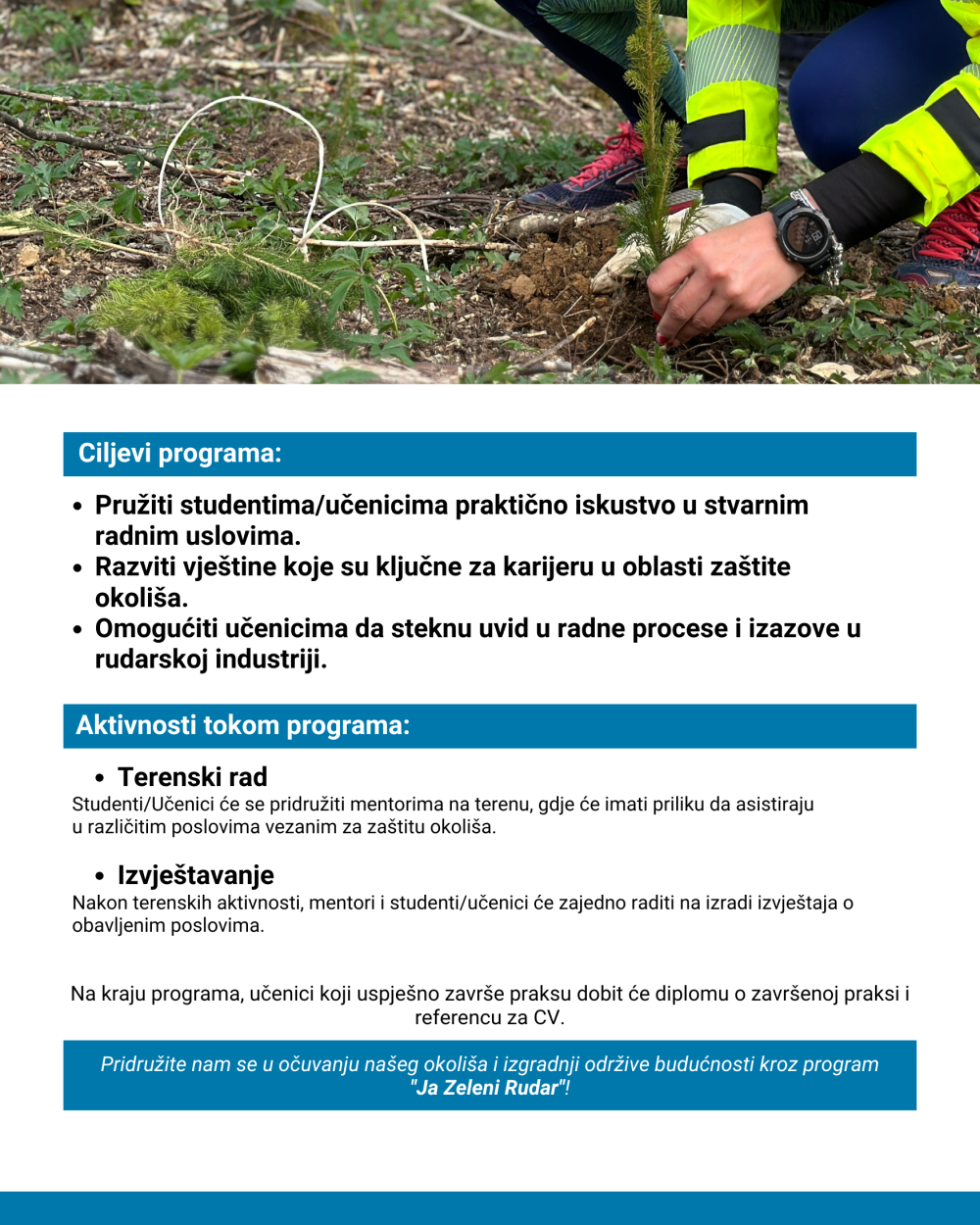 „Pozivamo sve zainteresovane studente i učenike da se jave na ovaj konkurs i pridruže nam se u očuvanju našeg okoliša i izgradnji održive budućnosti kroz program „Ja Zeleni Rudar”. Na kraju programa, učenici koji uspješno završe praksu dobit će Diplomu o završenoj praksi što će biti jedna od važnih referenci za njihov CV. Na ovaj način želimo podijeliti naše znanje i dragocjena iskustva sa studentima i učenicima iz lokalne zajednice, i vjerujemo da će neki od njih sutra biti zaposlenici naše ili neke druge kompanije koja ima najviše standarde zaštite okoliša“, isitiču u kompaniji Adriatic Metals BH d.o.o. .