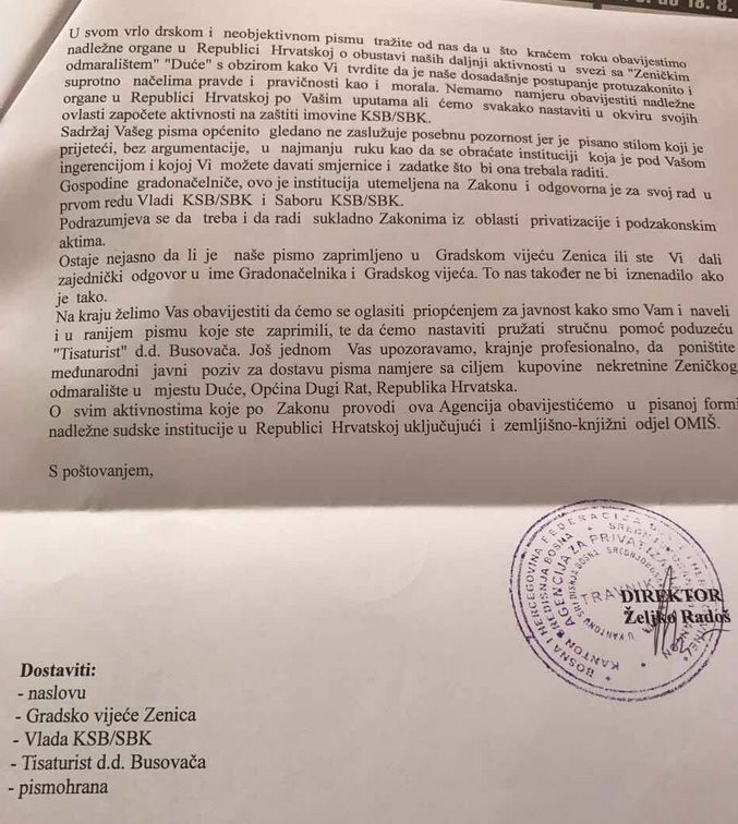 Nastavljeno dopisivanje o Dućama: Agencija za privatizaciju SBK/KSB o Kasumovićevom odgovoru – Agencija za privatizaciju SBK/KSB, nakon što je gradonačelnik Zenice odgovorio na nedavni dopis agencije, uputila je odgovor gradonačelniku Zenice Fuadu Kasumoviću u kojem još jednom, pored ostalog, traži hitno poništavanje Međunarodnog javnog poziva za prodaju odmaralište Duće u Republici Hrvatskoj.