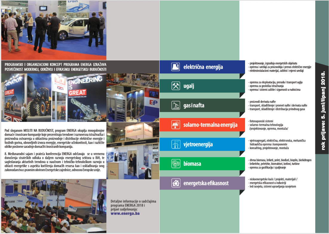 Sarajevo će tokom Međunarodnog sajma i konferencije ENERGA 2018 biti regionalni energetski centar na kojem će se okupiti više od 100 izlagača iz 15 zemalja kako regije tako i svijeta, a koji će predstaviti proizvode, projekte, ideje i usluge svojih kompanija. ENERGA se održava pod sloganom MISLITI NA BUDUĆNOST / THINKING THE FUTURE.