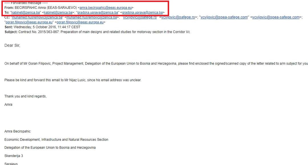 Pomenuti emailovi su, naglašavam prilažući dokaze, upućeni na dvije službene email adrese gradonačelnika i Gradske uprave Zenice [email protected] i [email protected], te na još niz adresa, uključujući gradonačelnikove savjetnike, nekoliko konsultanata EU i nekoliko fizičkih osoba sa područja Zenice.