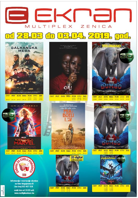 Naredna filmska sedmica u Multiplexu „Ekran“ Zenica publici nudi i više nego zanimljiv program. Naime, sa prikazivanjem počinju dva nova filma i to akcija-drama „Balkanska međa“, te avantura „Dumbo“. „Balkanska međa“ je akciona drama inspirisana stvarnim događajem koji se odigrao 12. juna 1999. godine, kada je bataljon ruskih padobranaca zauzeo aerodrom Slatina u Prištini. Ova 24-satna akcija od velike geopolitičke važnosti, motivisala je ruske scenariste da kroz splet ličnih drama glavnih junaka, prenesu priču o istorijskoj prekretnici koju je međunarodna javnost ocijenila kao mogući početak novog velikog rata. Glavnu ulogu u ovom filmu ostvaruje zvijezda filma Južni vetar, Miloš Biković.