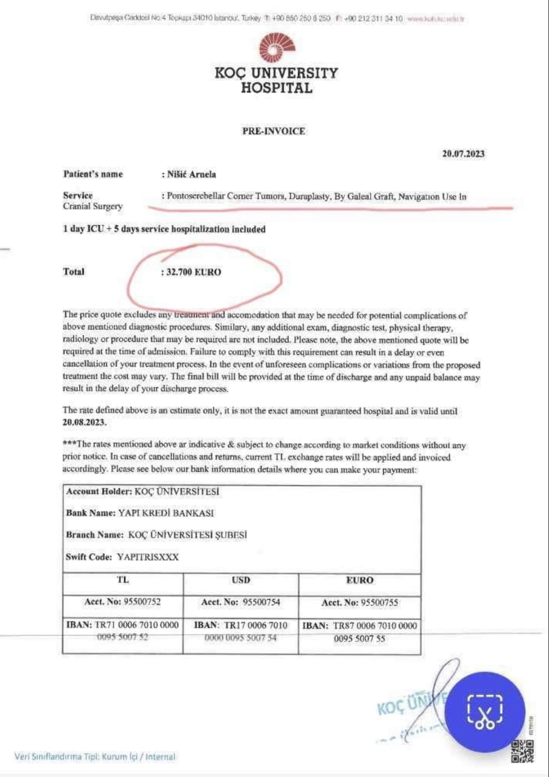 Nakon početnog optimizma i nade da će operaciju MASIVNOG TUMORA MOZGA moći obaviti u Kantonalnoj bolnici Zenica, odnosno bilo gdje u BiH, ova hrabra žena, pomoć je prisiljena potražiti van granica BiH, tačnije u Turskoj, klinika Koc University Hospital.