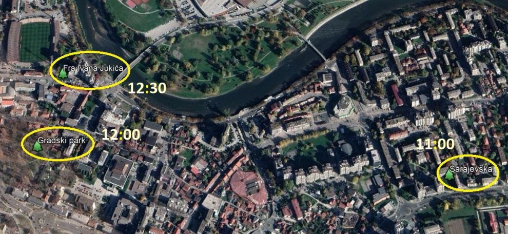 - 11:00 – Livada preko puta Doma Armije (raskrsnica ulica Sarajevska i Begagića put)