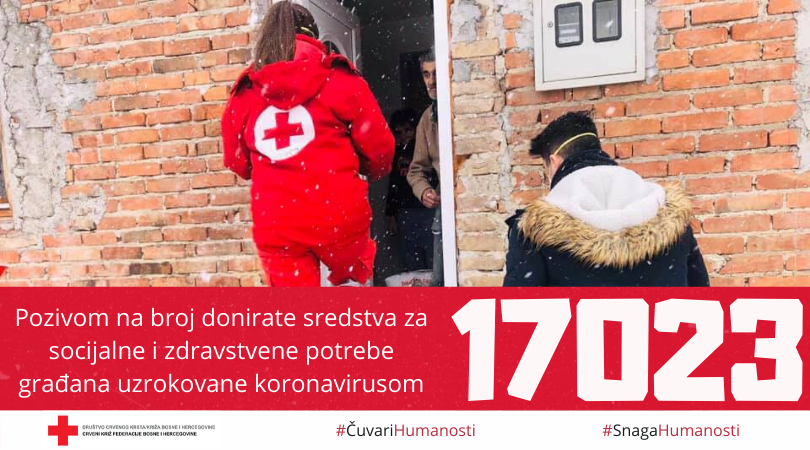 „Crveni križ Federacije BiH pokrenuo je kampanju ‘Budimo čuvari humanosti’. Sredstva se prikupljaju za socijalne i zdravstvene potrebe naših građana uzrokovane pojavom koronavirusa. Kao i svaki put, volonteri Crvenog križa svoj posao obavljaju tiho, učinkovito i dostojanstveno. Posebna pažnja posvećena je starijim od 65 godina, koji žive bez bližih srodnika. Crveni križ je već punih 108 godina u službi humanosti za svoje građane.