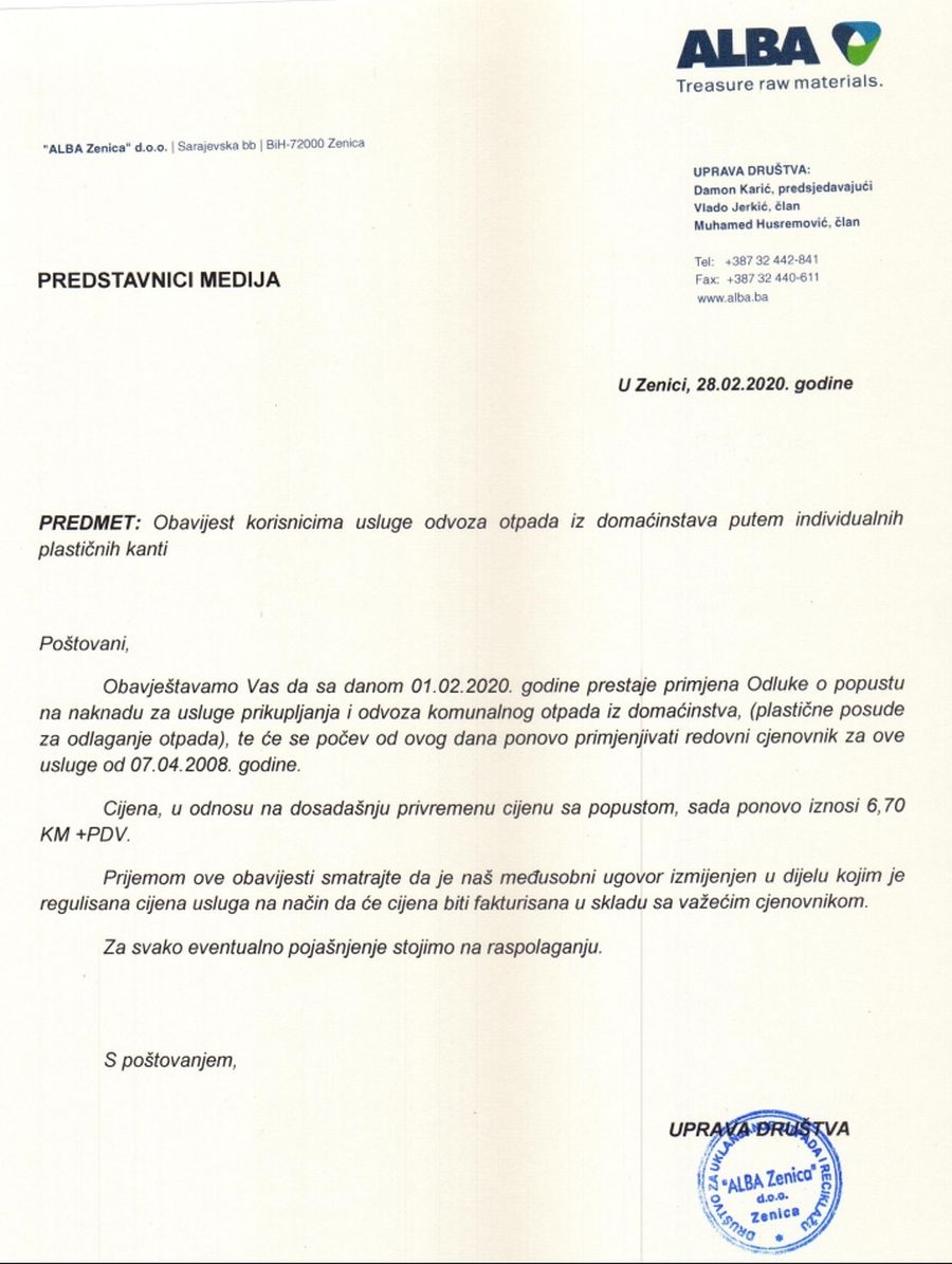 Naime, 2008. kad je zaživio sistem prikupljanja smeća putem kanti ustanovljen je cjenovnik od 6,70 KM plus PDV, ali je ALBA pristala da snizi cijenu na 5,13 KM plus PDV u cilju promocije vlastite usluge i zaživljavanja ovog sistema.