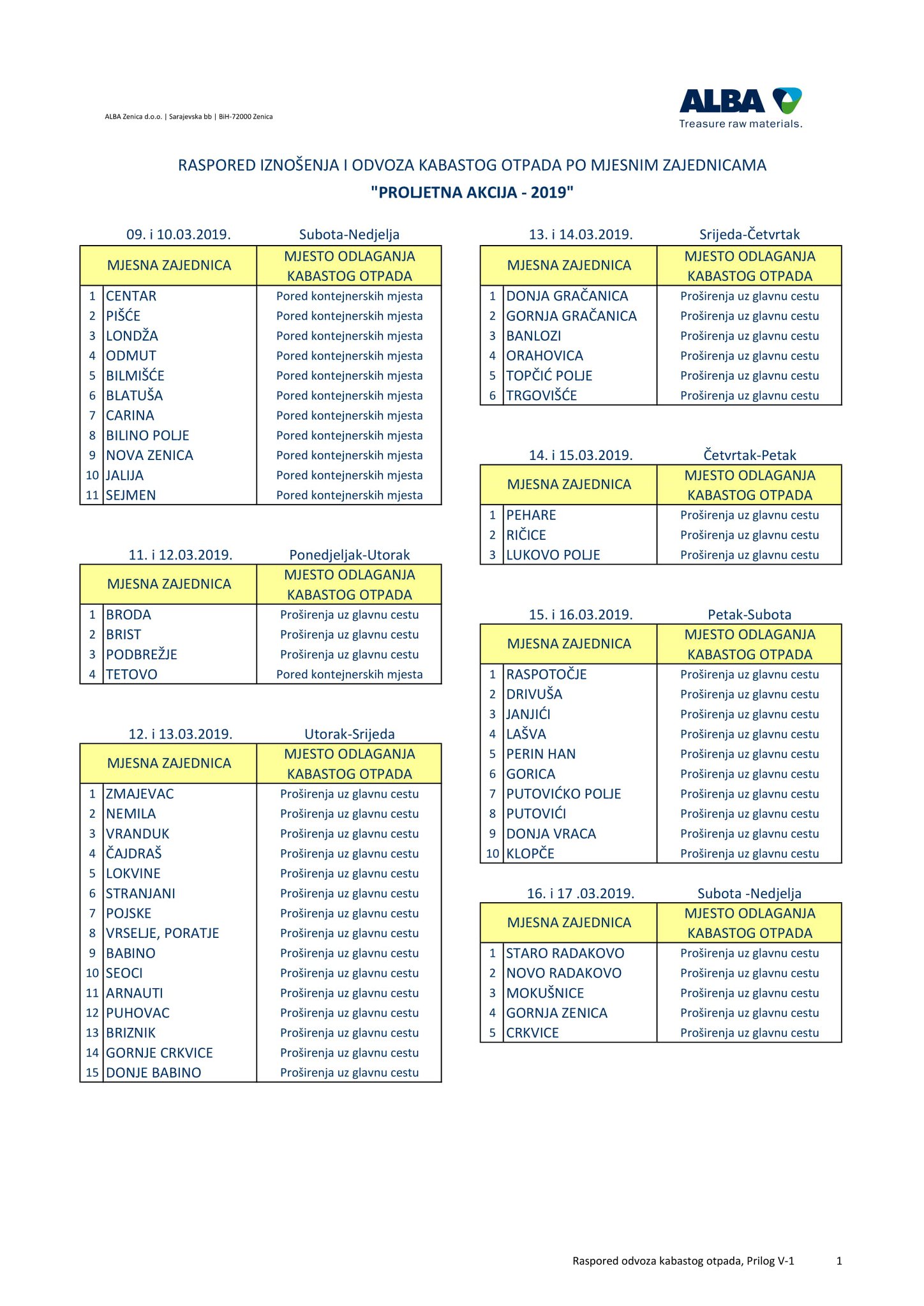ALBA: Odvoženje kabastog otpada – pročitajte raspored po MZ – Preduzeće „ALBA Zenica“ d.o.o. Zenica obavještava građane, cijenjene korisnike svojih usluga, da će se u periodu od 09.03. – 17.03.2019. godine vršiti prikupljanje i odvoz kabastog otpada po mjesnim zajednicama u općini Zenica, u kojima je uspostavljen sistem organizovanog odvoza otpada, prema prethodno utvrđenom rasporedu.