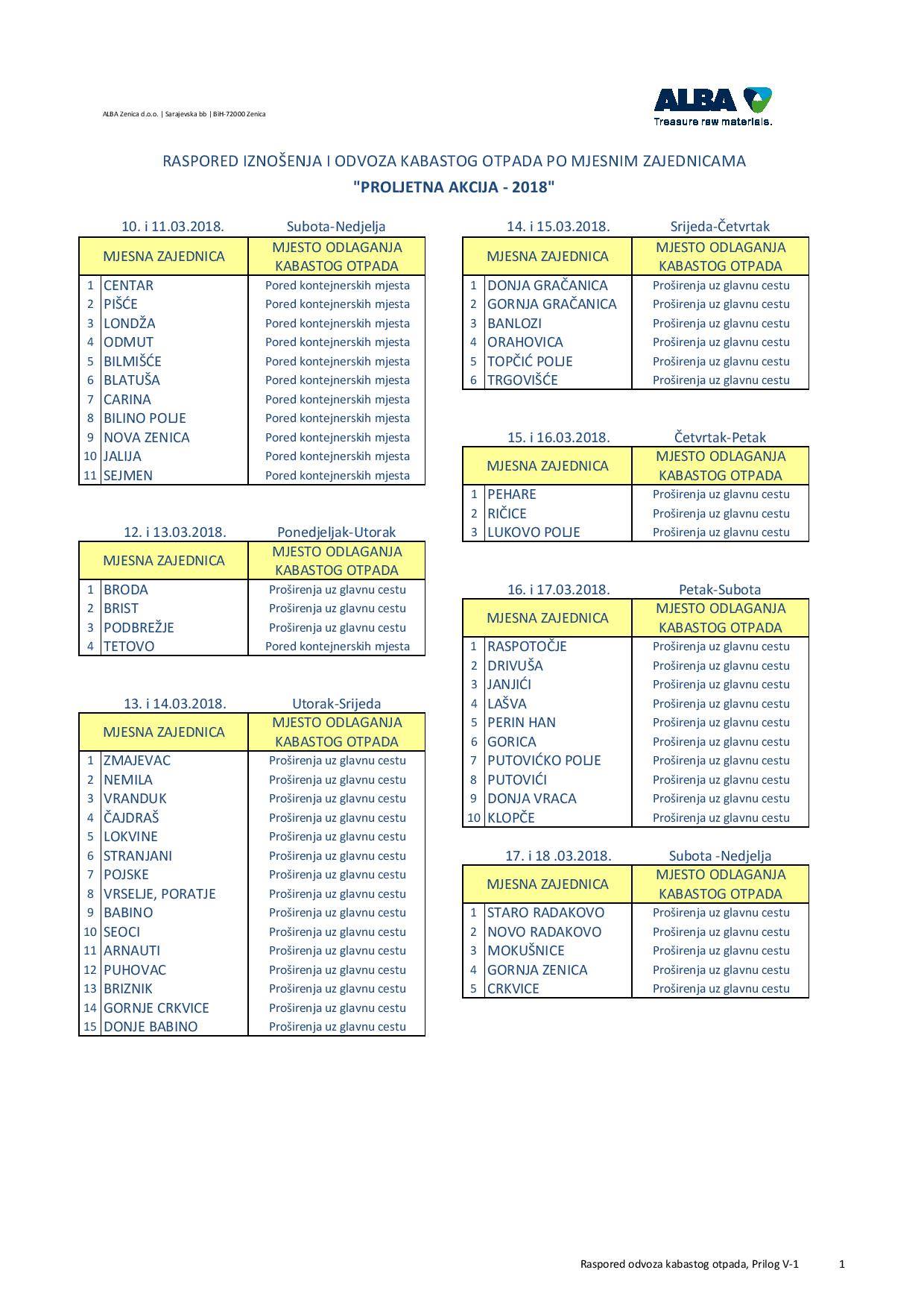 ALBA: proljetna akcija prikupljanja i odvoza kabastog otpada po mjesnim zajednicama – Preduzeće „ALBA Zenica“ d.o.o. Zenica obavještava građane, cijenjene korisnike svojih usluga, da će se u periodu od 10.03. – 18.03.2018. godine vršiti prikupljanje i odvoz kabastog otpada po mjesnim zajednicama u općini Zenica, u kojima je uspostavljen sistem organizovanog odvoza otpada, prema prethodno utvrđenom rasporedu.