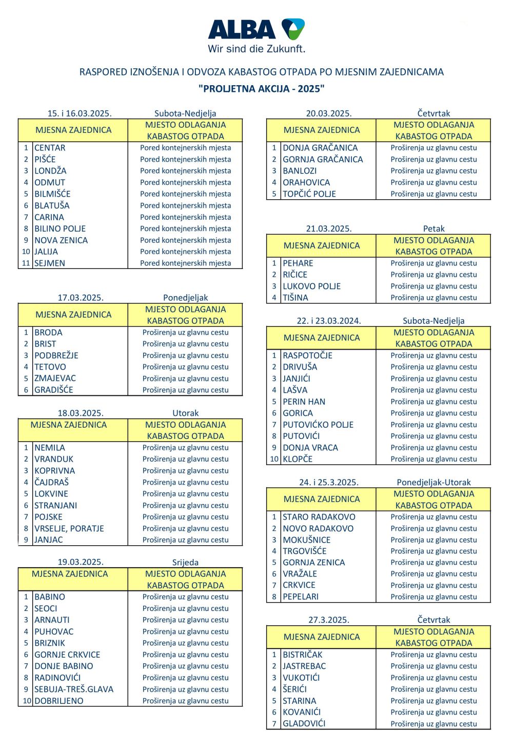 ALBA Zenica: Akcija odvoza kabastog otpada “Proljetna akcija 2025”- Raspored odvoza kabastog otpada “Proljetna akcija 2025” ALBA Zenica u periodu 15 – 27.03.2025. godine: