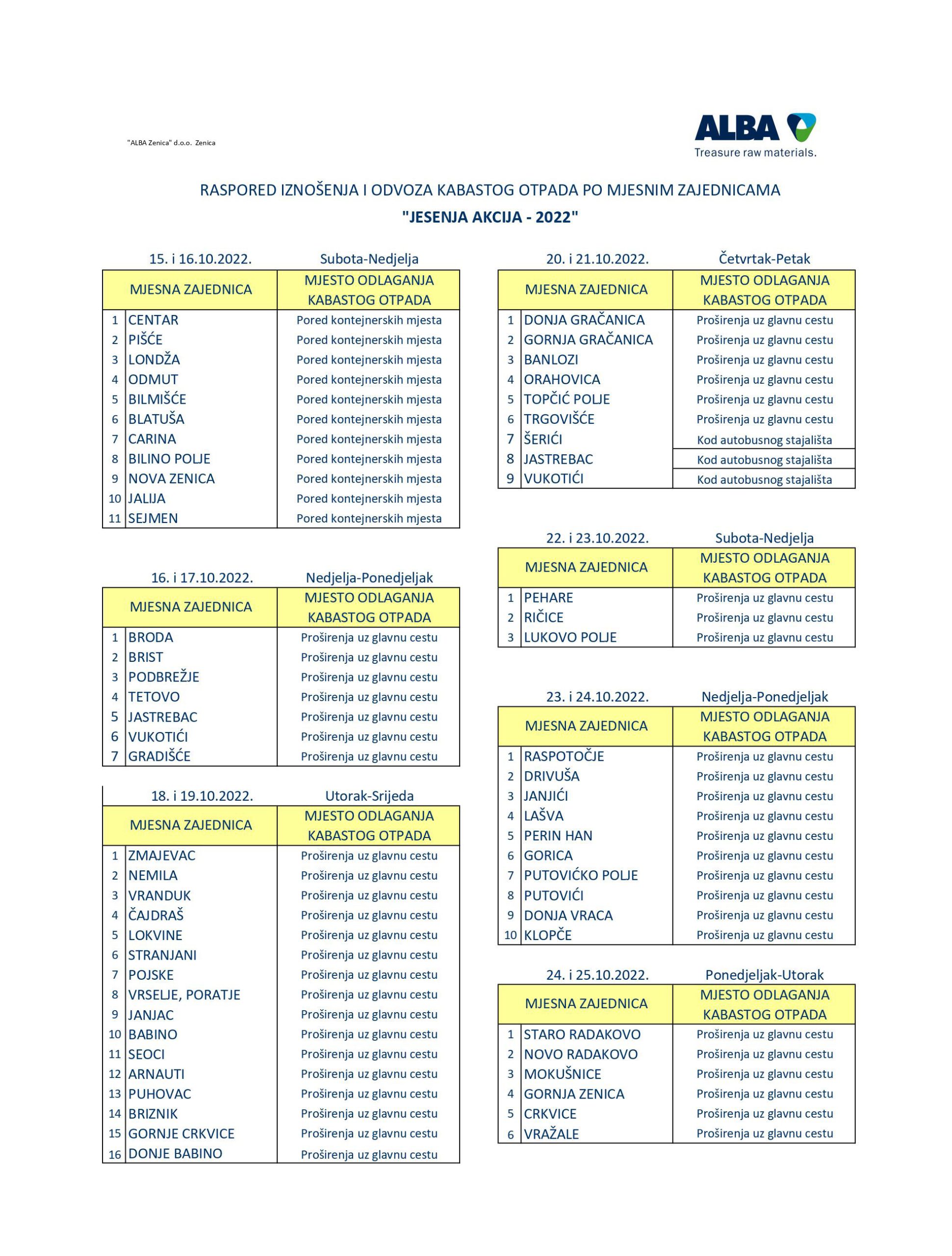 ALBA Zenica: Jesenja akcija odvoza kabastog otpada- ALBA Zenica je u okviru svojih redovnih aktivnosti napravila plan odvoza kabastog otpada “Jesenja akcija 2022”. Raspored po naseljima sa terminima možete pogledati u prilogu: