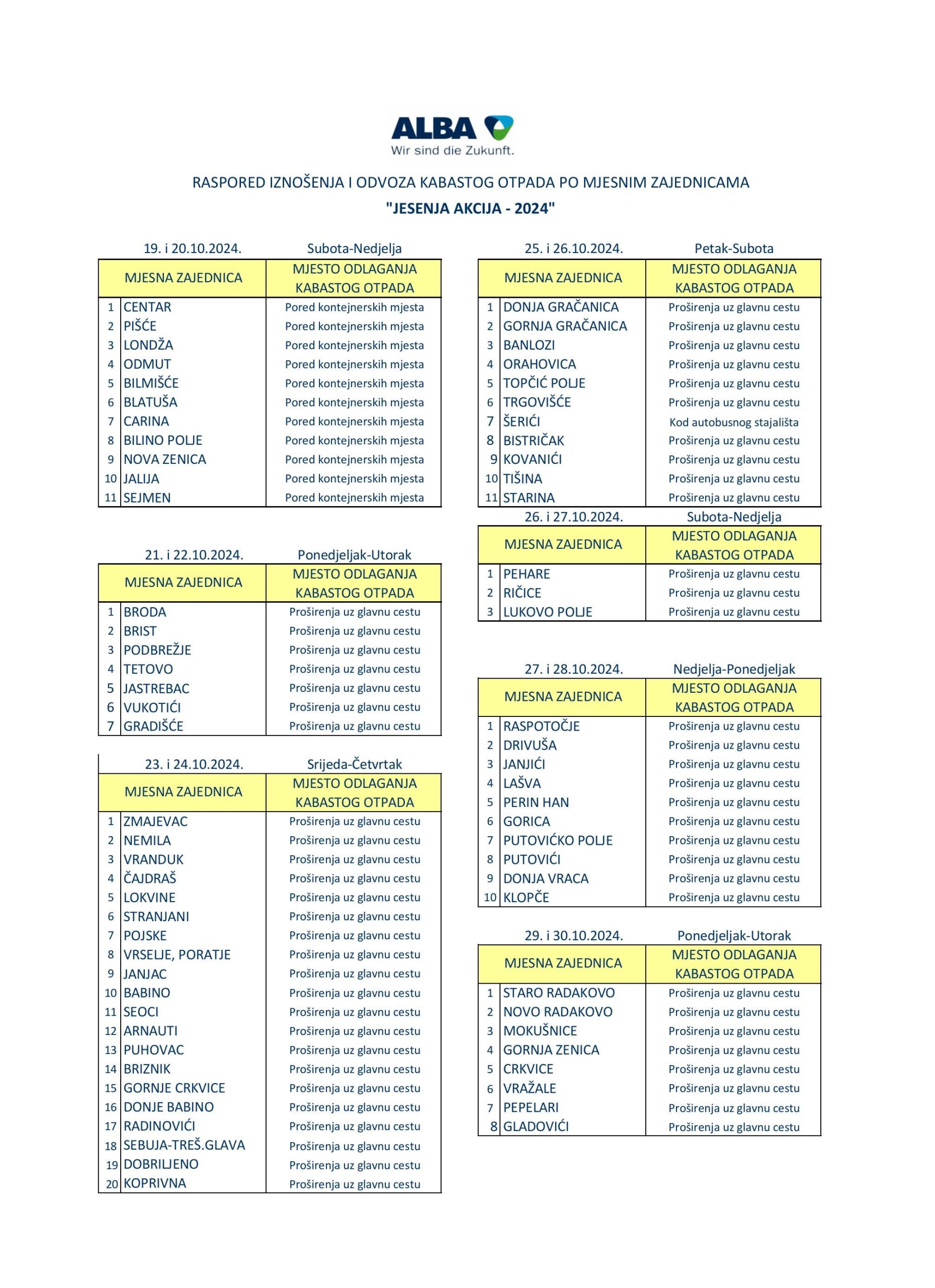 Kompanija ALBA Zenica kao i svake godine objavljuje raspored odvoza kabastog otpada “Jesenja akcija 2024”.