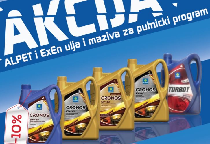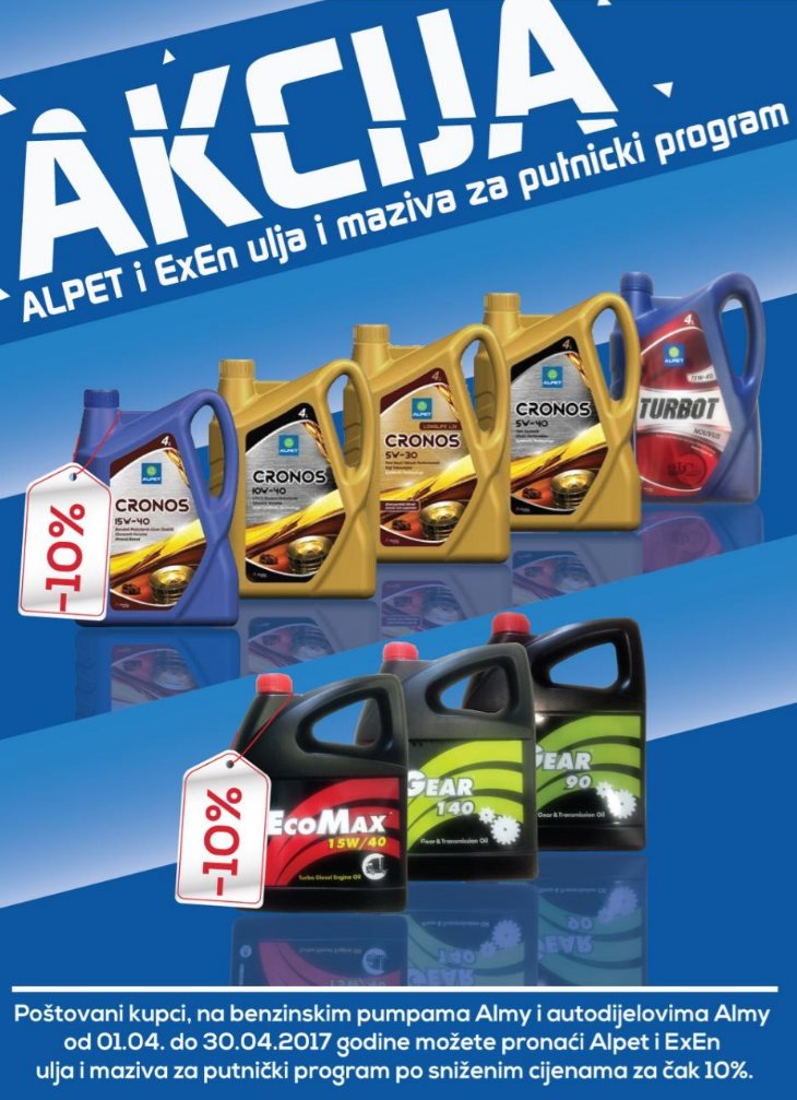 Almy: Akcija Alpet ExEn – Cijenjeni kupci kompanije Almy, na benzinskim pumpama u Zenici i Zavidovićima te u prodavnici autodijelova možete kupiti ulja i maziva renomiranih svjetskih proizvođača Alpet i ExEn po akcijskim cijenama sniženim 10%.