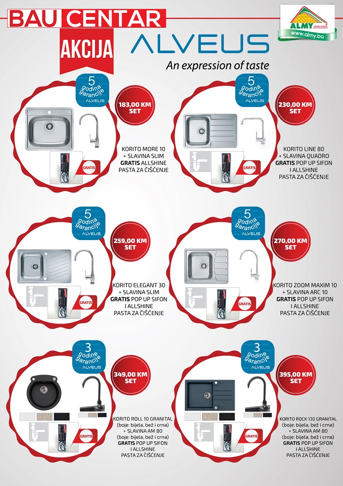 Almy Bau centar – akcija korita i slavina slovenskog proizvođača ALVEUS – “Bau centar Almy Zenica nudi Vam korita i slavine slovenskog proizvođača ALVEUS po akcijskim cijenama sa 3 i 5 godina garancije.