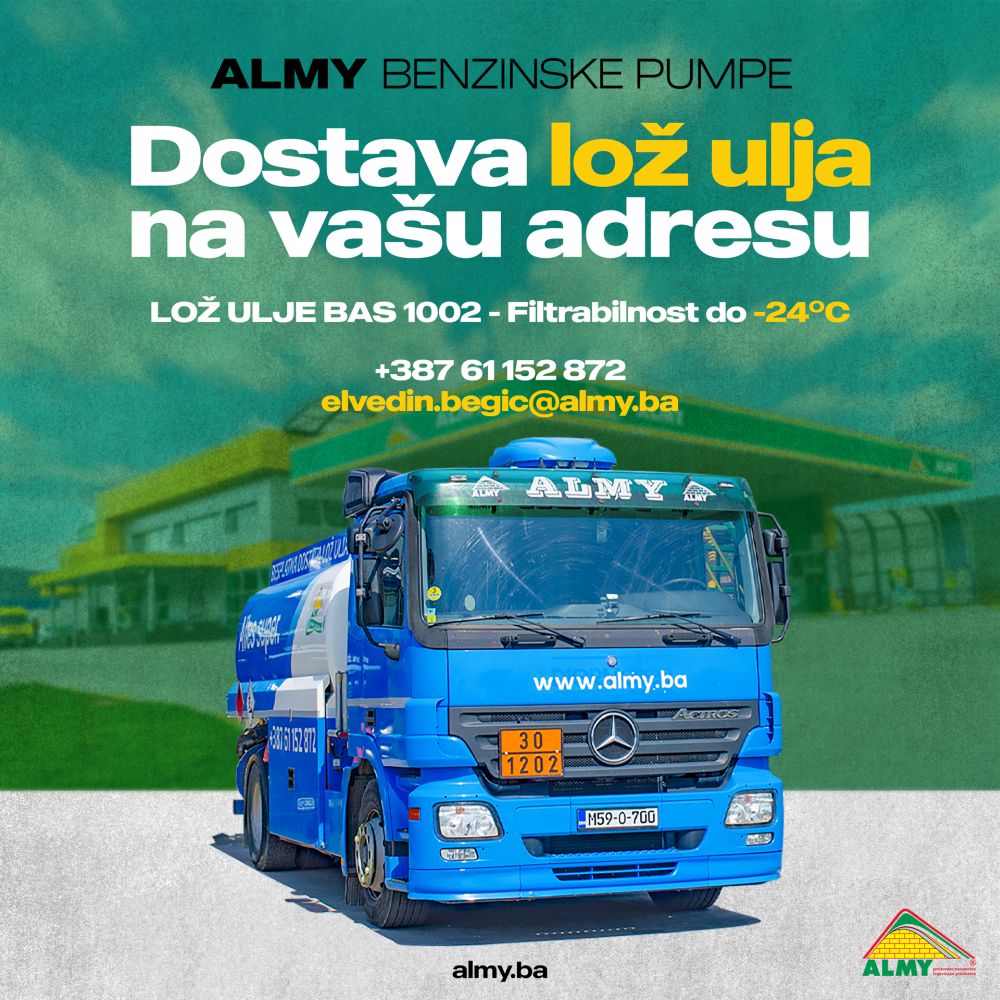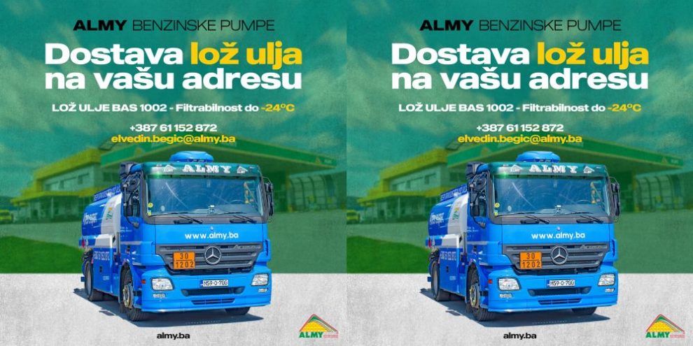 Almy: Dostava lož ulja na teritoriju cijele BiH!- Kompanija Almy vrši dostavu lož ulja na teritoriju cijele Bosne i Hercegovine.