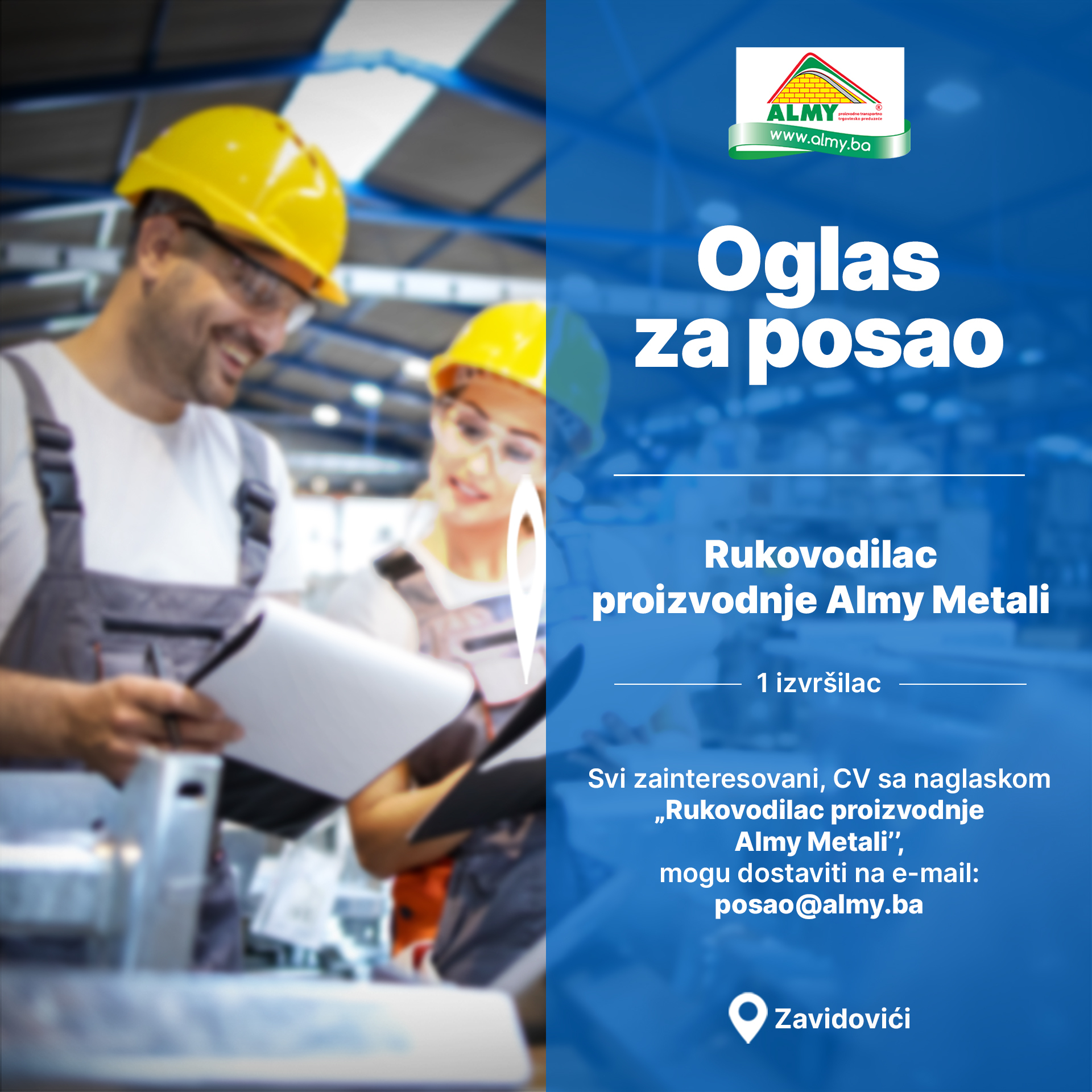 | Rukovodilac proizvodnje Almy Metali – 1 izvršilac;