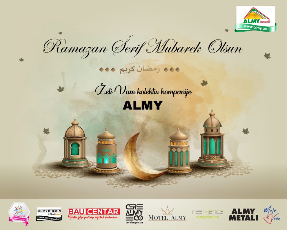 Almy Zenica: Ramazan Šerif Mubarek Olsun- Povodom nastupanja mubarek mjeseca Ramazana, kolektiv kompanije Almy d.o.o. upućuje čestitku svim muslimanima širom naše domovine i dijaspore. Ramazan Šerif Mubarek Olsun!