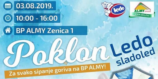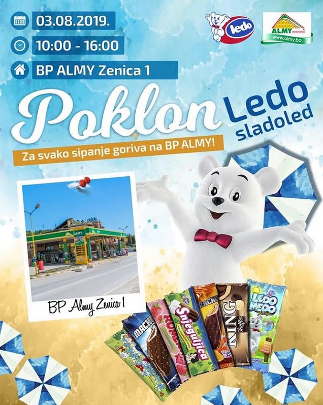 Ove subote smo na benzinskoj pumpi ALMY ZENICA 1, od 10:00 do 16:00h. Za svako točenje goriva – gratis Ledo sladoled.