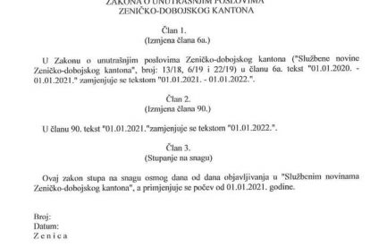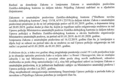 Prva tačka dnevnog reda glasi Prijedlog Zakona o izmjenama Zakona o unutrašnjim poslovima Zeničko-dobojskog kantona – skraćeni postupak – u nastavku možete preuzeti ili vidjeti taj prijedlog – po kojem se za JOŠ jednu godinu pomjera provođenje SAMOSTALNOSTI Uprave policije od Ministarstva.