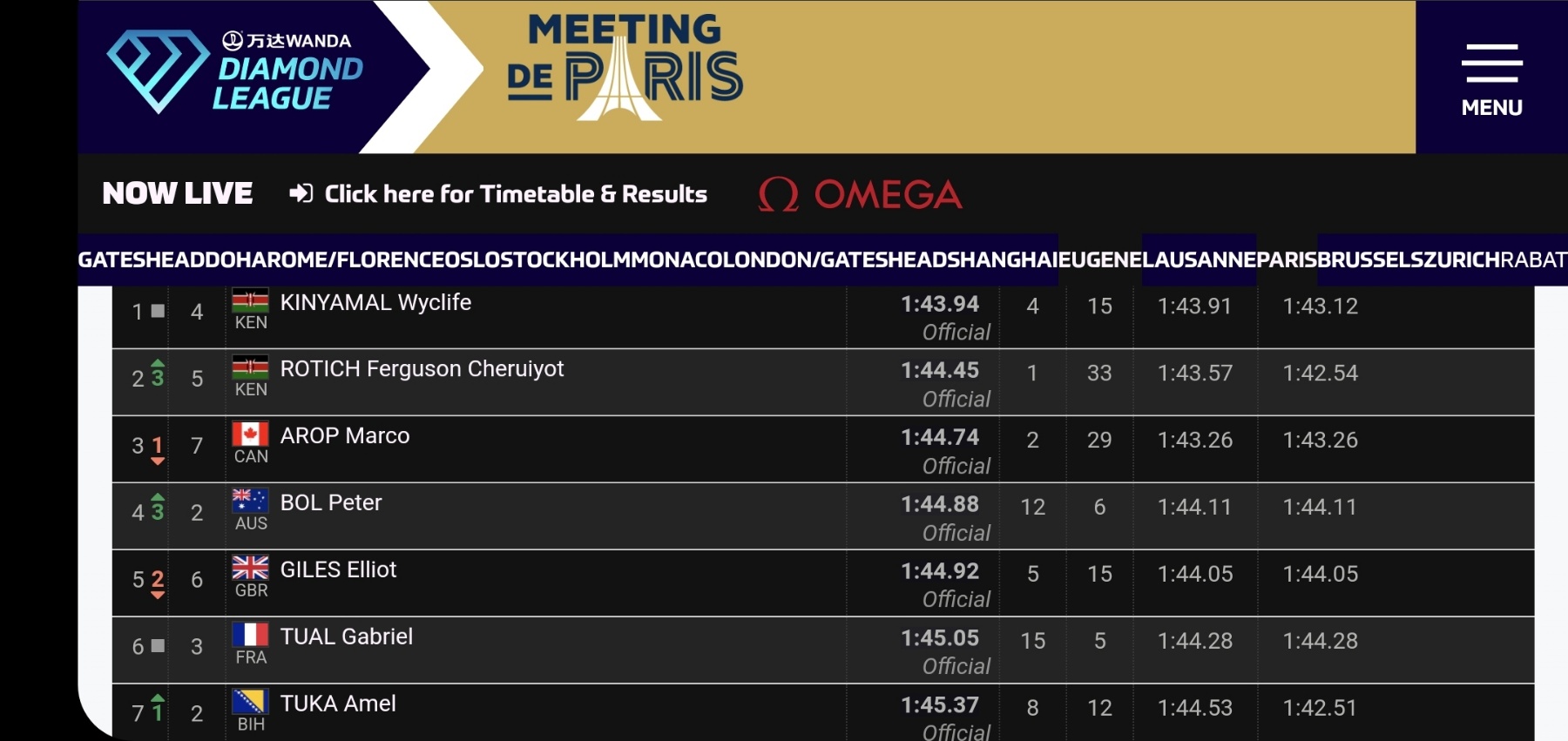 Najbrži danas je bio Wyclife Kinyamal iz Kenije s vremenom 1:43.94. Drugi je bio njegov zemlja Ferguson Cheruiyot Rotich (1:44.45), dok je treći bio Kanađanin Marco Arop (1:44.74).