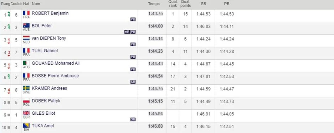 Slavio je Francuz Benjamin Robert s vremenom 1:43.75, a iza njega su ostali Australac Peter Bol (1:44.00) i Tony Van Diepen (1:44.14).