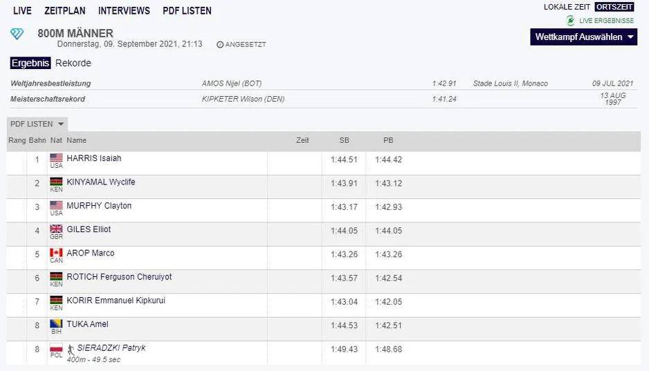 Rivali u večerašnjem finalu će mu biti: Isaiah Harris (SAD), Wyclife Kinyamal (Kenija), Clayton Murphy (SAD), Elliot Giles (Velika Britanija), Marco Arop (Kanada), Cheruiyot Ferguson Rotich (Kenija), Kipkurui Emmanuel Korir (Kenija) i Patryk Sieradzki (Poljska).