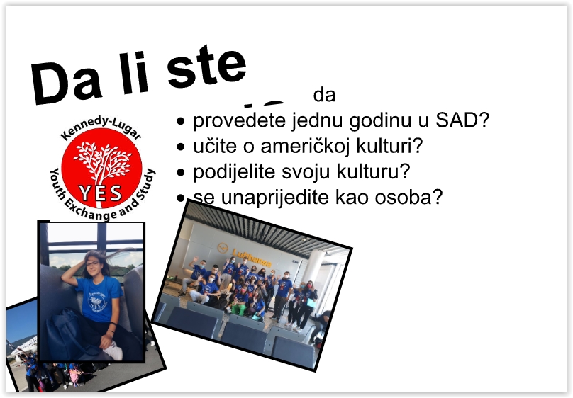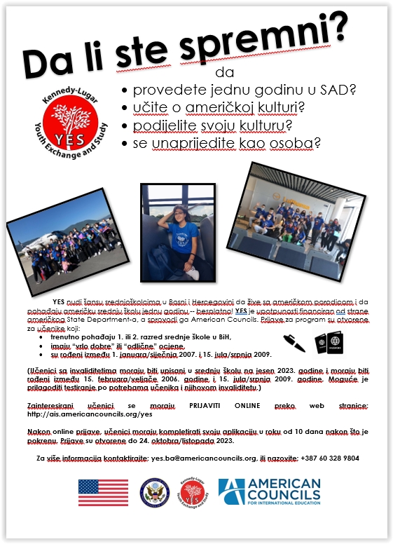 Američki Kutak Zenica s ponosom najavljuje otvaranje aplikacija za Kennedy-Lugar Youth Exchange (YES) stipendije za srednjoškolce iz Bosne i Hercegovine. Ovo je izvanredna prilika za sve učenike prvog i drugog razreda srednjih škola u Bosni i Hercegovini da provedu narednu školsku godinu u Sjedinjenim Američkim Državama potpuno besplatno.