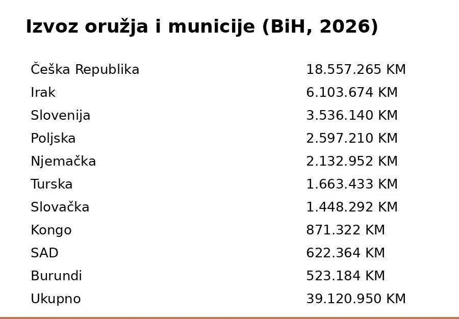 Osim oružja i municije, Bosna i Hercegovina je u prva dva mjeseca ove godine izvezla i eksplozive, pirotehničke i slične proizvode – koji također spadaju u namjensku industriju – u vrijednosti od oko 16,2 miliona KM.