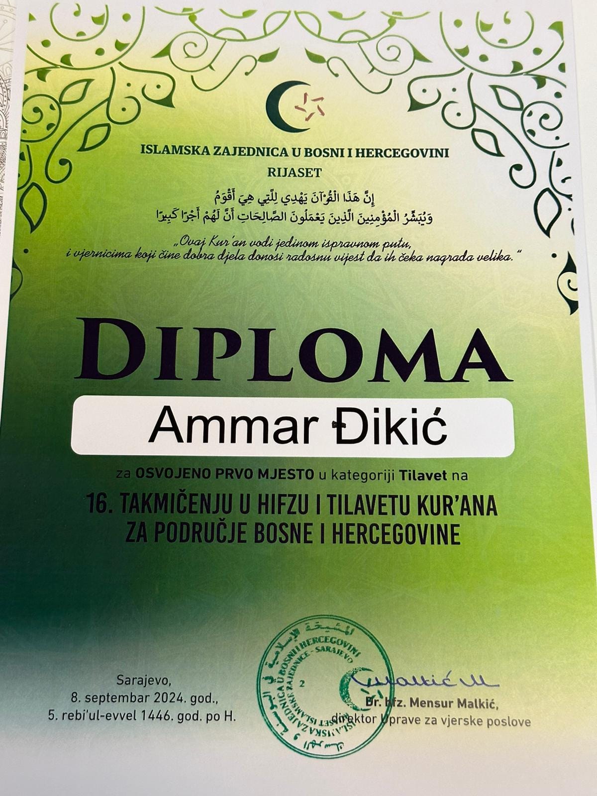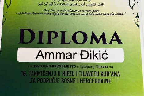 Ammar ef. Đikić iz Ensar džamije pobjednik u kategoriji Tilavet na 16. takmičenju u hifzu i tilavetu za područje BiH