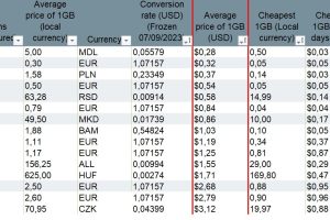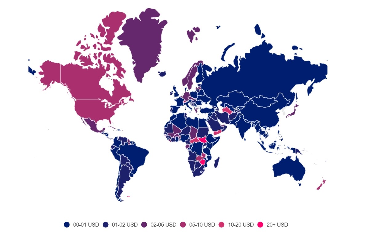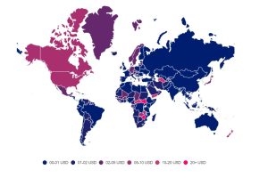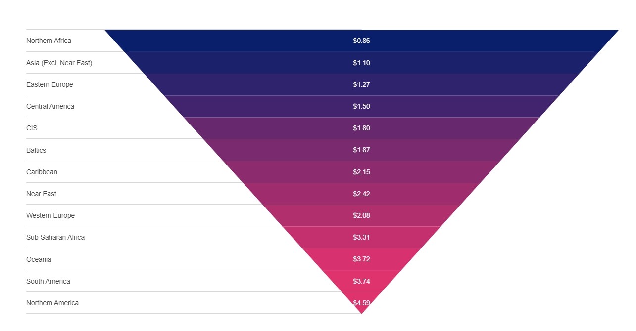 Pogleda li se raspodjela po regijama, vidimo da je Sjeverna Afrika najjeftinija što se tiče mobilnog surfanja, s prosječnom cijenom od 0,86 USD za gigabajt, a slijedi je Azija, dok je “naša” regija, Istočna Europa, na trećem mjestu s prosječnom cijenom od 1,27 USD za gigabajt prenesenih podataka. Najskuplje regije su Južna i Sjeverna Amerika s prosječnih 3,74 odnosno 4,59 USD.