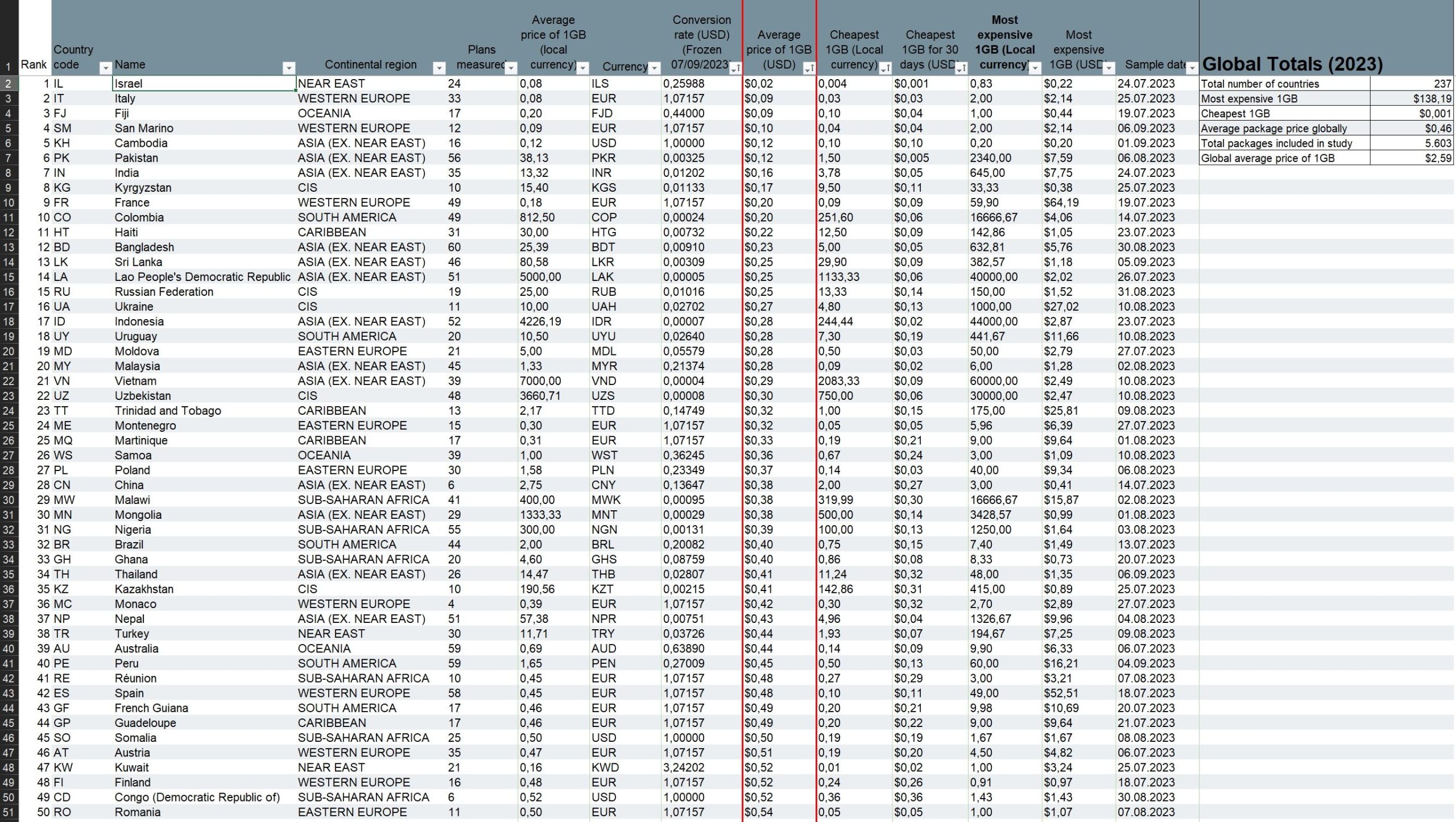 Gledano prema prijenosu 1 GB mobilnih podataka te prosječnoj cijeni u mobilnim tarifama dostupnima u pojedinoj zemlji, najjeftinija zemlja na svijetu za mobilno surfanje je Izrael, gdje je cijena prijenosa jednog gigabajta podataka tek 2 (dolarska) centa. Slijede Italija i Fidži (0,09 USD), San Marino (0,1 USD) te Kambodža (0,12 USD).