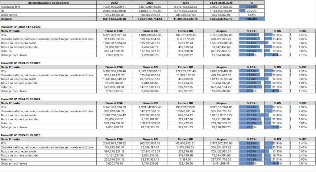Zamjenik ministra finansija i trezora BiH Muhamed Hasanović objavio je grafikon i tabelarni prikaz prikupljenih i raspodijeljenih prihoda od indirektnih poreza za period 2022., 2023. i 2024. godinu, kao i za prvih pet mjeseci 2025. godine gdje se može jasno vidjeti po svakoj stavci prihoda koliko ko doprinosi.