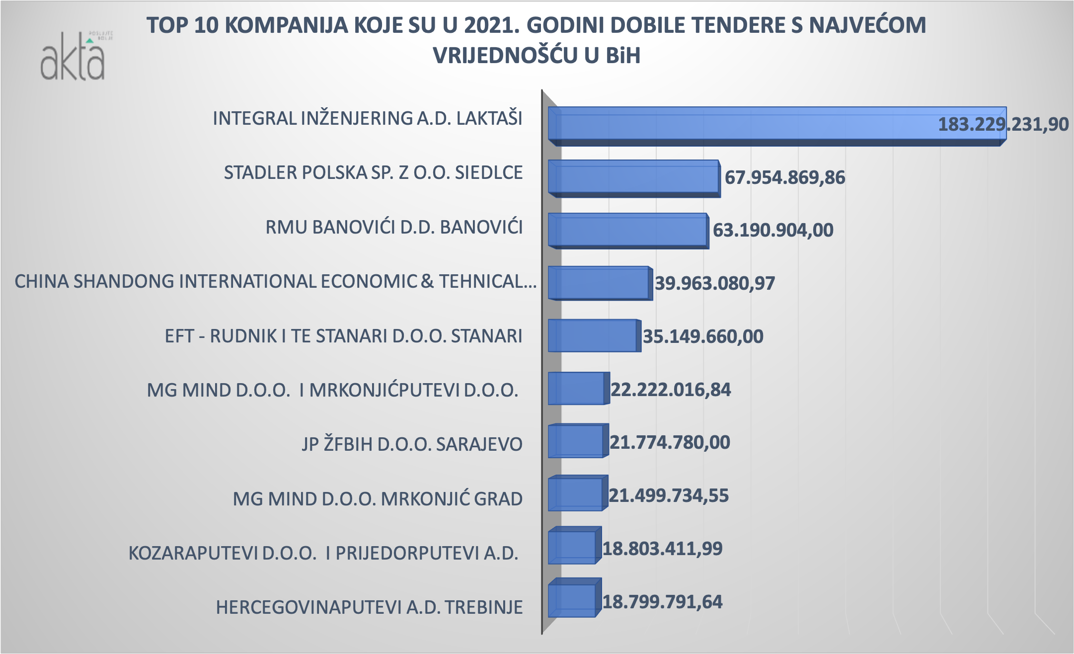Kompanija Integral inženjering a.d. Laktaši imala je u 2021. godini najvrijedniji ugovor, odnosno dobijeni tender u BiH, pokazuje analiza javnih nabavki na portalu Akta.ba.