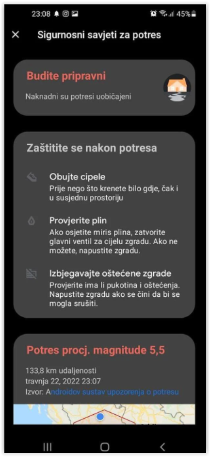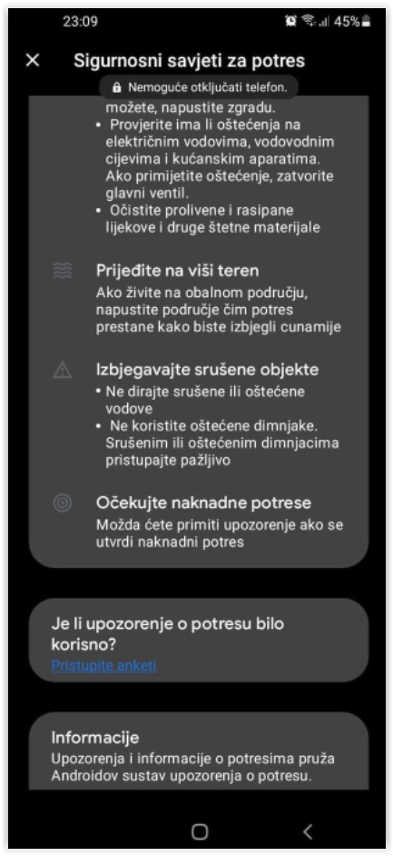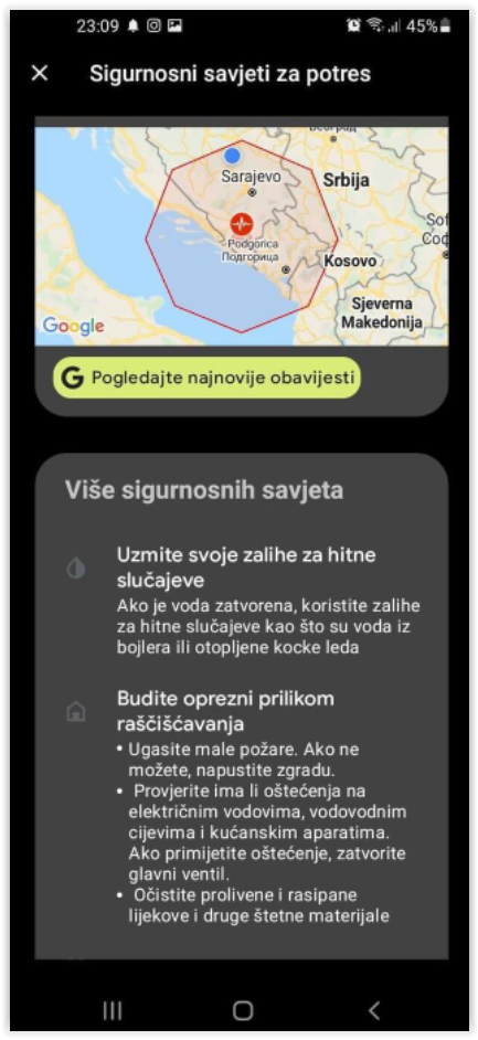 Androidov sistem upozorenja o zemljotresu je poslao jasnu poruku da građani budu u pripravnosti, da su naknadni potresi uobičajeni tokom smirivanja tla te sa smjernicama šta uraditi nakon potresa.