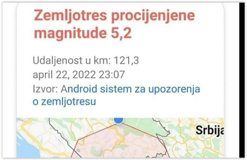 Brojni građani Bosne i Hercegovine večeras su nekoliko sekundi prije nego što su osjetili zemljotres dobili obavijest od Androidovog sistema upozorenja o potresu da je moguć zemljotres te smjernice šta uraditi.