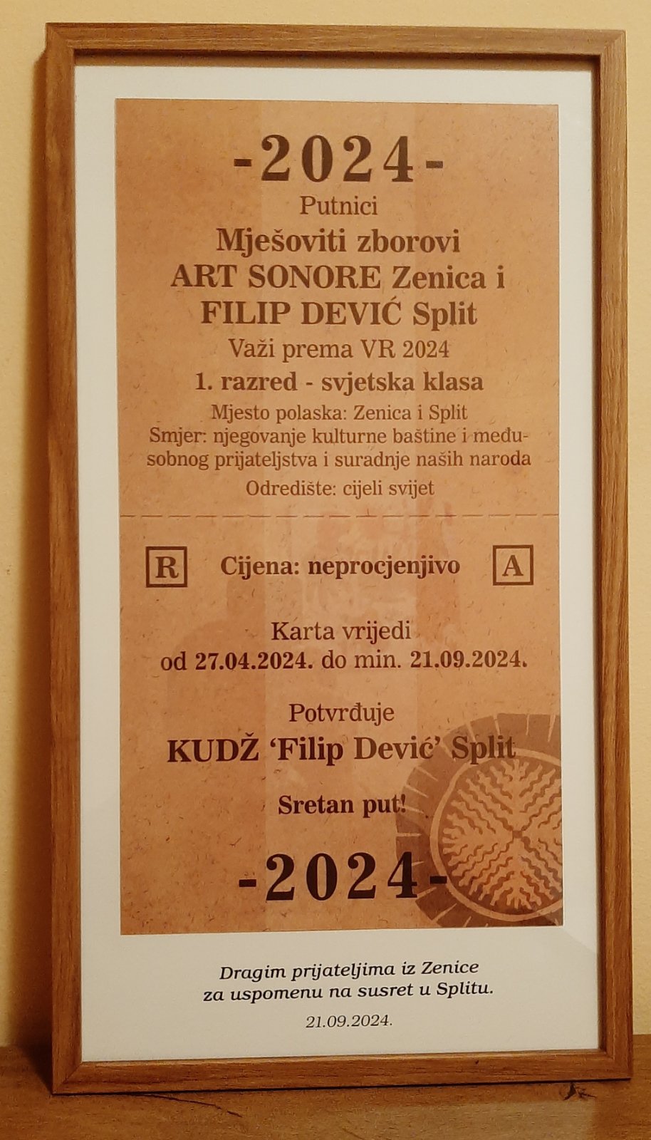 U subotu, 21.09.2024.god. u Hrvatskom domu Split, održan je Koncert „Večer dalmatinske pjesme i sevdalinke“ na kojem je hor „Art Sonore“ bio gost KUDŽ „Filip Dević“ Split, sa kojim je već uspostavljen saradnja i koji su bili gosti na koncertu dalmatinske pjesme i sevdalinke u Zenici u sklopu manifestacije Zeničko proljeće 2024.