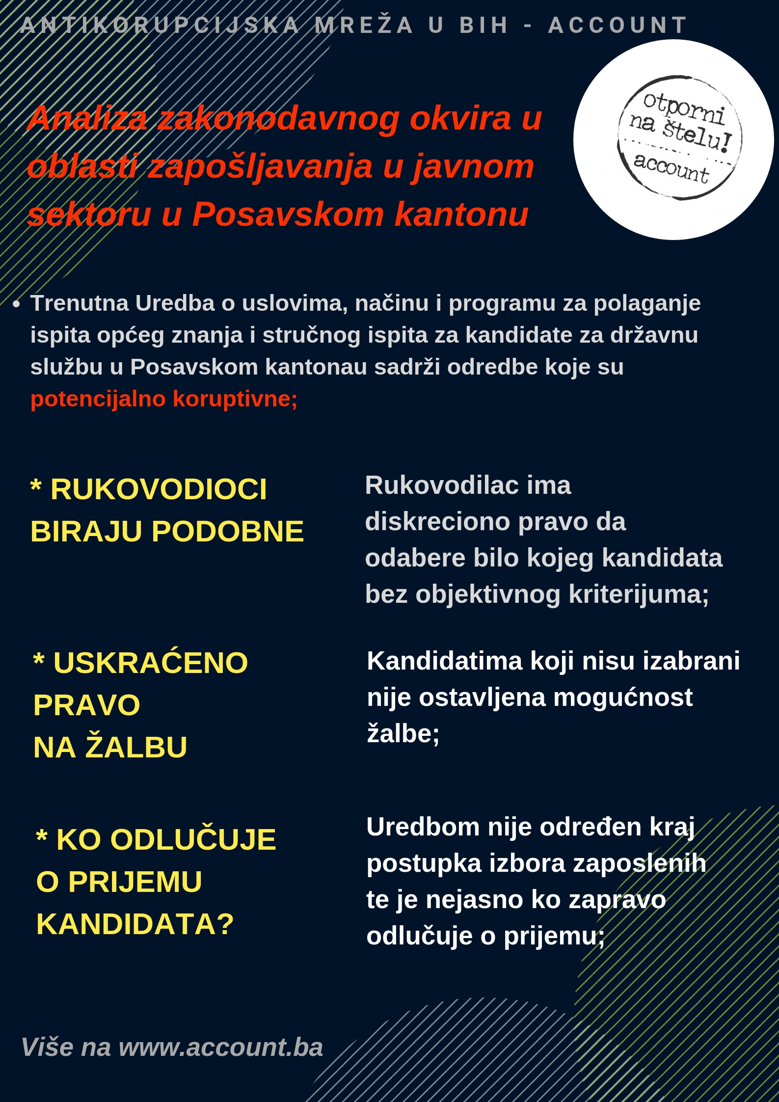 Helsinški odbor za ljudska prava je sačinio analizu u saradnji sa partnerskim organizacijama, članicama ACCOUNT Sektorske grupe zapošljavanje: CGS Livno, ALDI Goražde, KAM Zenica. Aktivnost je realizovana u okviru projekta Antikorupcijska mreža u BiH – ACCOUNT.