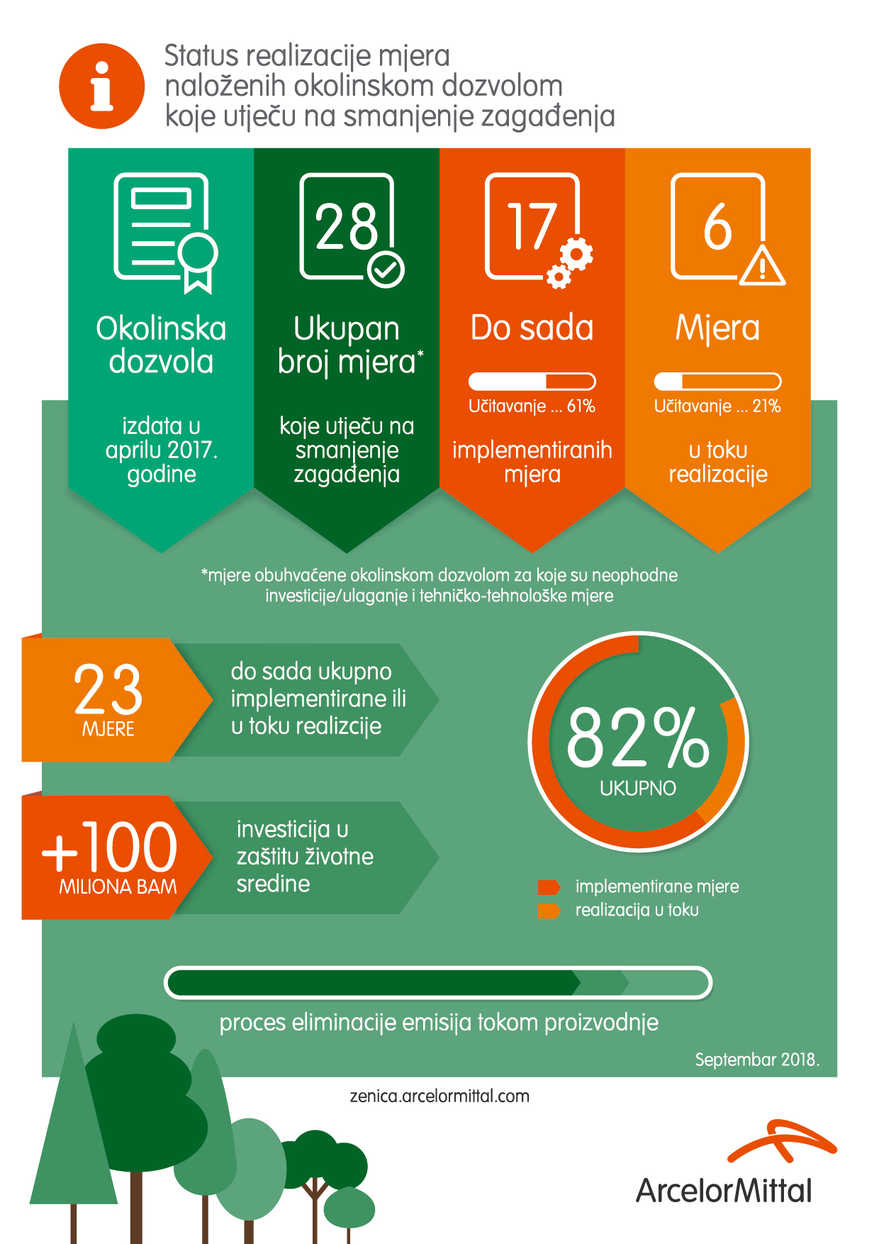 ArcelorMittal Zenica: status realizacije mjera koje utječu na smanjenje zagađenja  – Zbog manipuliranja podacima i širenja netačnih informacija sa kojim se susrećemo već nekoliko dana, a u vezi sa mjerama propisanim Okolinskom dozvolom i projektima na kojima ArcelorMittal Zenica radi u svrhu smanjenja zagađenja u Gradu Zenica, ArcelorMittal Zenica objavljuje tačne, jasne i provjerljive podatke: