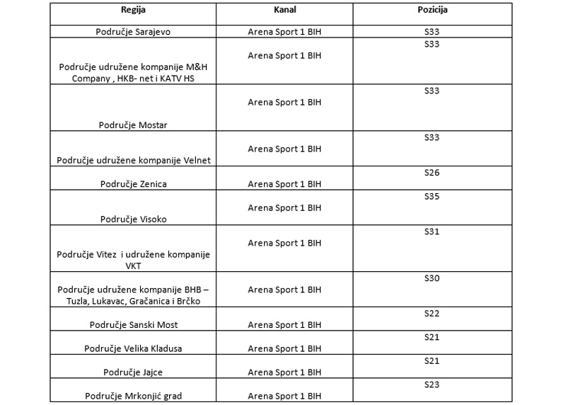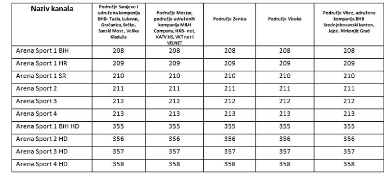 Arena Sport 1 kanal u okviru osnovnog paketa (analogna kablovska televizija) bi će dostupan na sljedećim pozicijama: