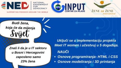 Želiš naučiti osnove web programiranja i 3D modeliranja i printanja? Žena si i imaš preko 20 godina? Centar za mlade INPUT u saradnji s volonterkom...