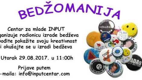 Centar za mlade INPUT organizuje kreativnu radionicu izrade bedževa pod nazivom BEDŽOMANIJA u utorak 29.08.2017. u 11:00h. Izrađivati ćemo bedževe...