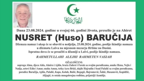 Dana 23. avgusta 2024. godine, u svojoj 66. godini života, na Ahiret je preselio Nusret (Huso) Baručija. Nusret (Huso) Baručija bio je ugledni...