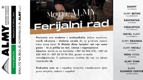 FERIJALNI RAD U MOTELU ALMY ZA SVE STUDENTE I SREDNJOŠKOLCE OVOG LJETA! Pozivamo sve studente i srednjoškolce željne avanture, novih iskustava i...