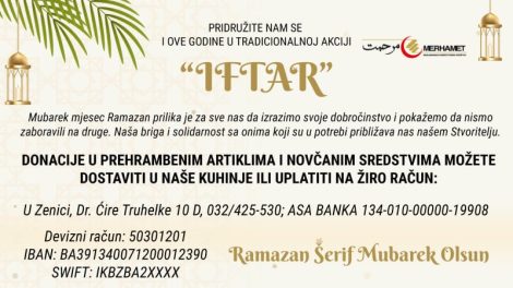 Ovim putem želimo podsjetiti da “Merhamet” Regionalni odbor Zenica, tradicionalno, i ove godine organizuje akciju “IFTAR”, te da uz zajedničko učešće...